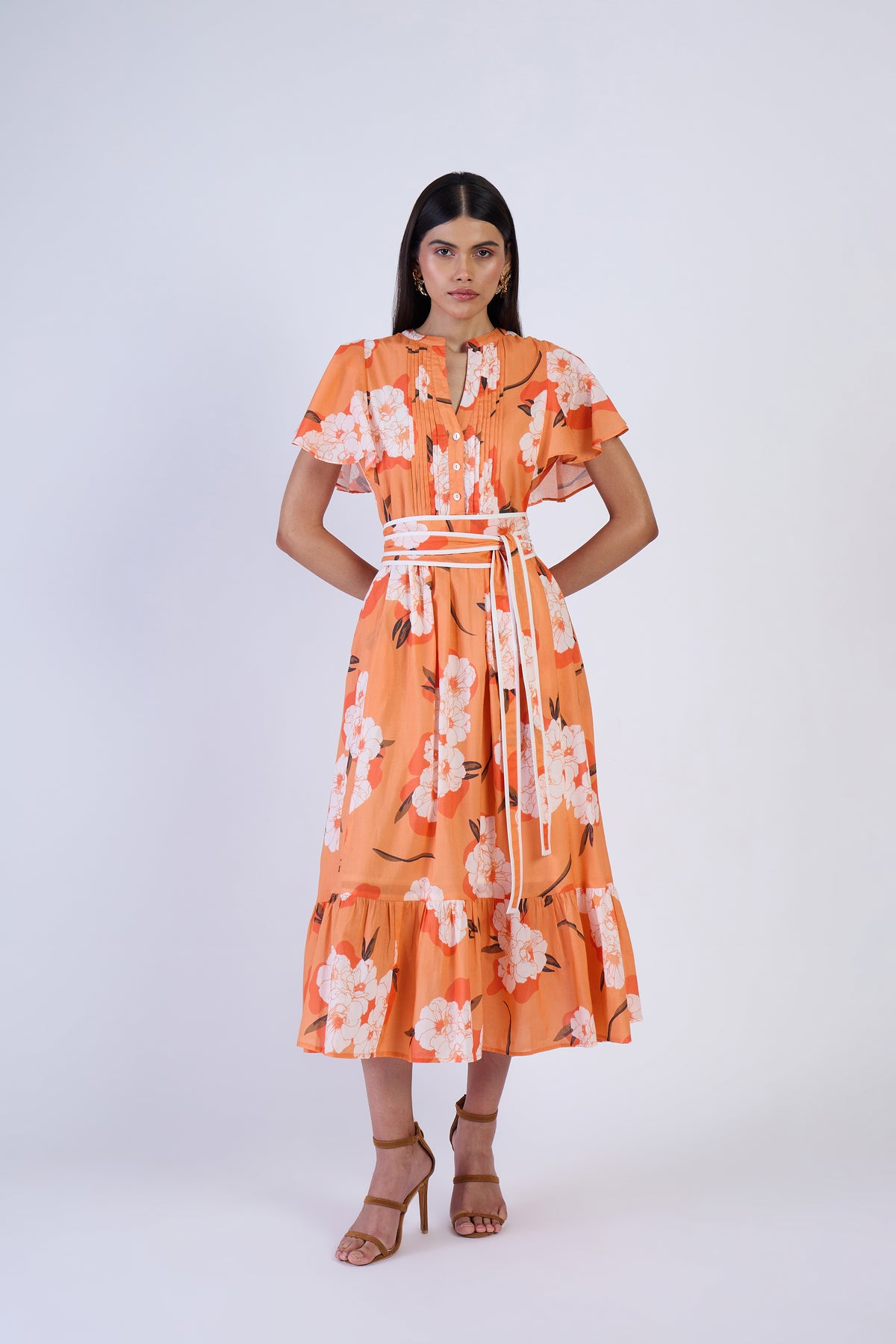 It's all in the details: Leni features subtle pleats on the bodice, silhouette-enhancing flutter sleeves and a ruffled hem. Cut loose for a universally flattering fit, the featured Obi belt gives you the flexibility to highlight your waist as desired. Leni is made from airy cotton voile soft, breathable, and effortlessly breezy. Bold peonies bloom across this modern floral print, evoking afternoon tea in the garden of an old English manor. A vibrant nod to heritage with a contemporary twist.
