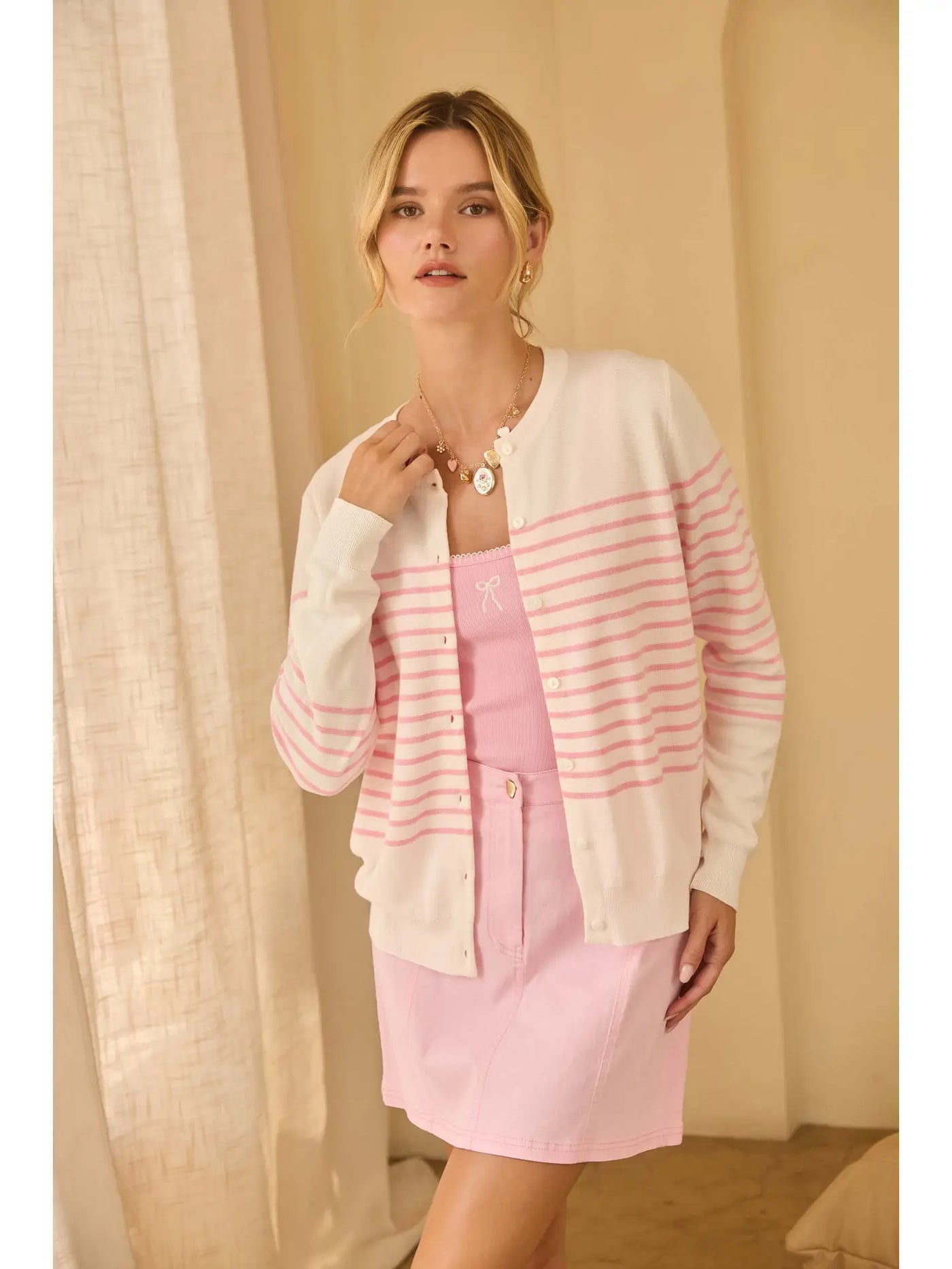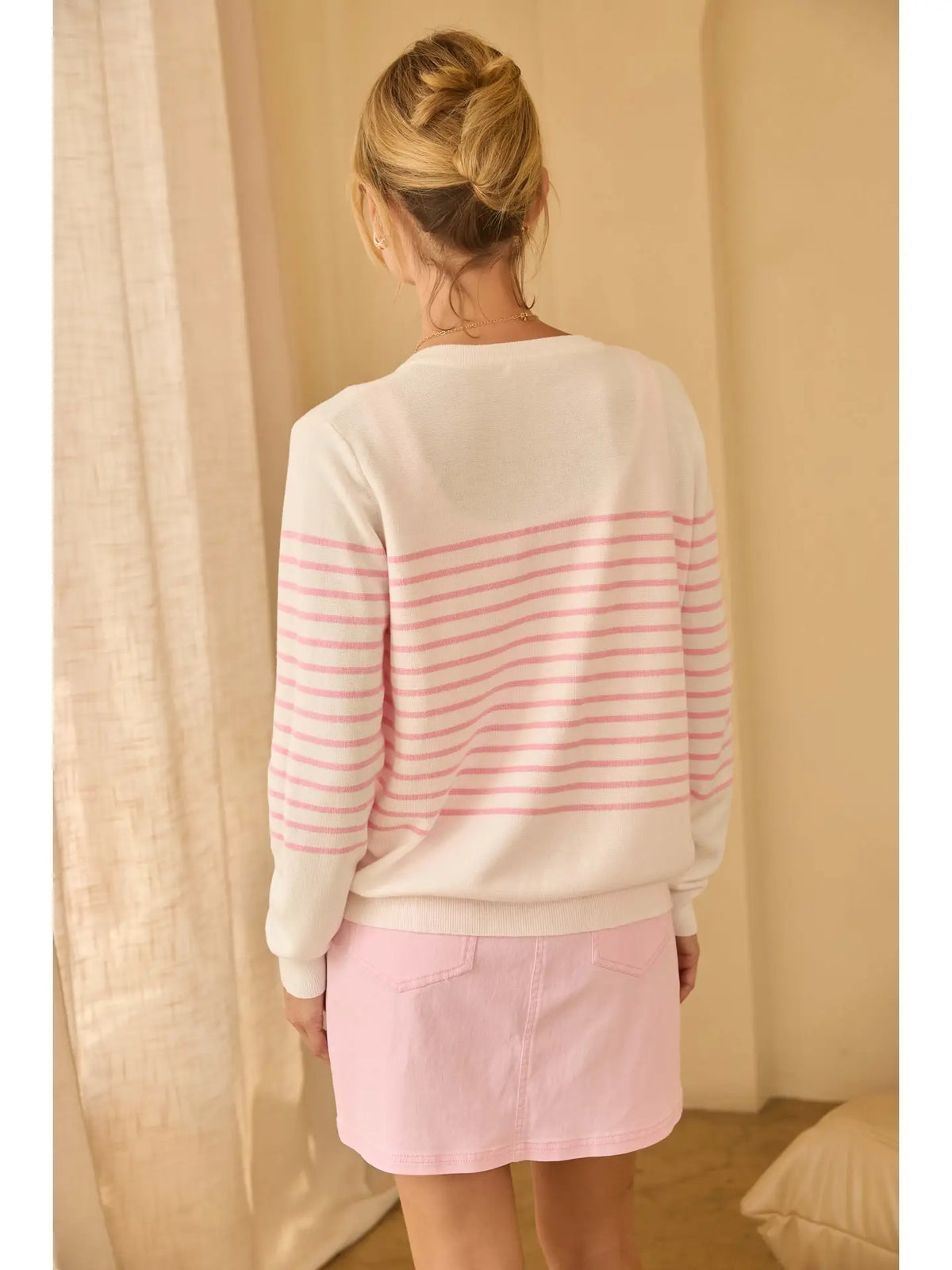 Classic comfort meets casual style in this striped button-down cardigan. Crafted with a soft knit, it features timeless stripes and a flattering button-front design for effortless layering. Perfect over a tee or dress, it adds a cozy yet polished touch to any outfit.
